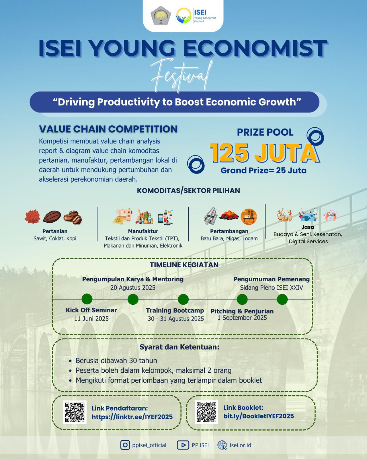 Ikatan Sarjana Ekonomi Indonesia (ISEI) akan menggelar Value Chain Competition (VCC) antar-mahasiswa ekonomi seluruh Indonesia. Kompetisi ini merupakan rangkaian dari kegiatan ISEI Young Economist Festival 2025 yang akan dimulai (kick off) pada 11 Juni 2025 dengan Seminar ISEI hingga digelarnya Sidang Pleno ISEI 2025 di Kota Manado, Sulawesi Utara, pada September 2025 mendatang.