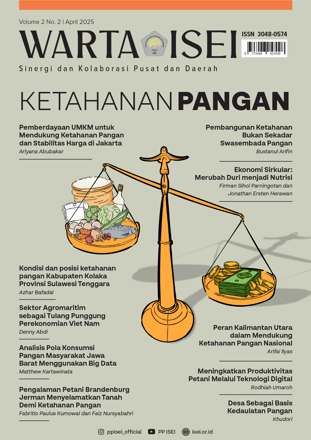 Puji syukur kita panjatkan ke hadirat Tuhan Yang Maha Esa atas rampungnya Warta ISEI Volume 2 Nomor 2 tahun 2025 yang mengangkat tema sangat strategis, yaitu Ketahanan Pangan. Di tengah dinamika global dan tantangan yang semakin kompleks, ketahanan pangan tetap merupakan isu kritikal yang tidak hanya menyangkut ketersediaan dan akses pangan semata, namun juga sebagai faktor penentu kesejahteraan masyarakat dan stabilitas nasional.