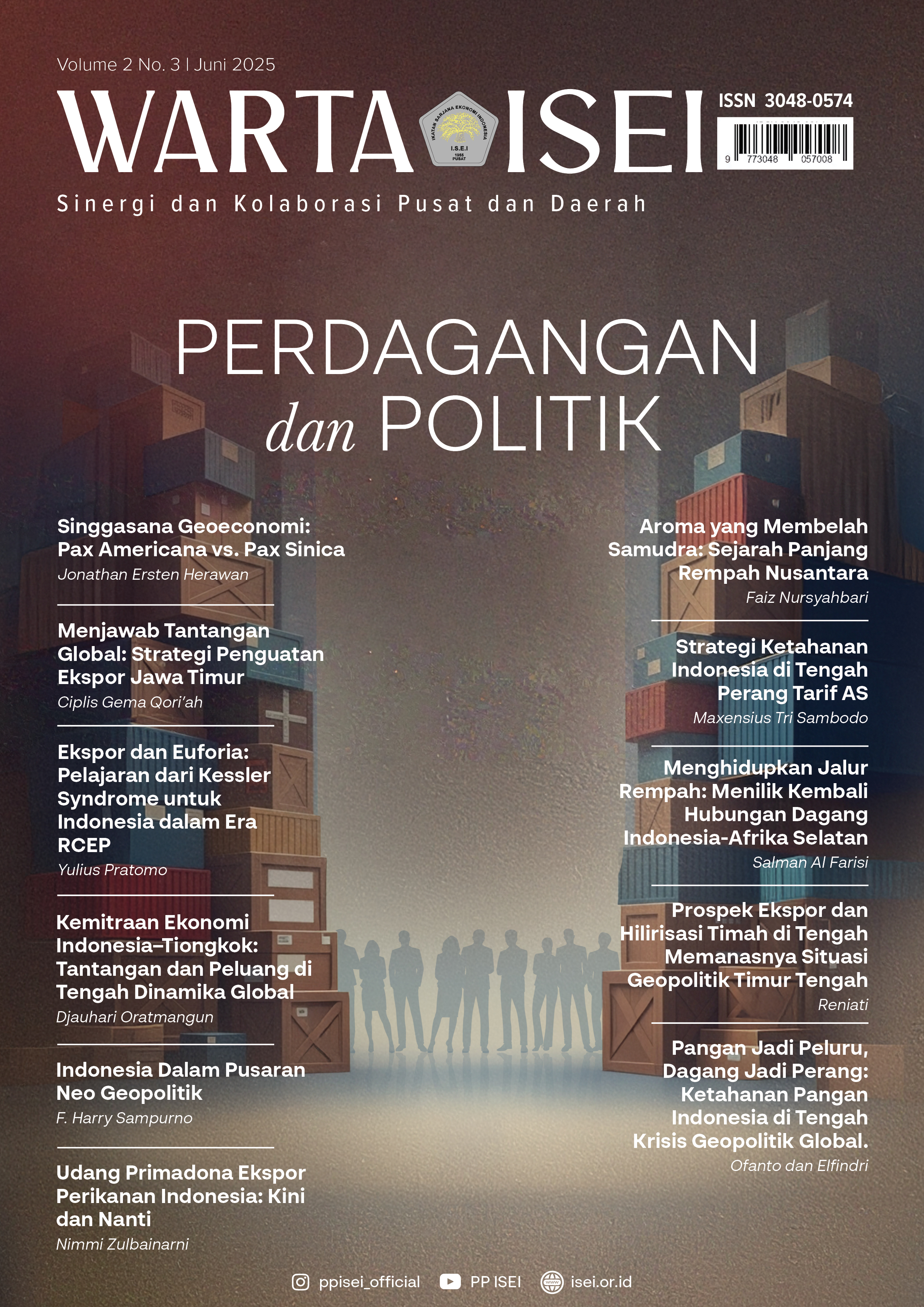 Tema penting yang diangkat Warta ISEI edisi ini dimulai dari menghidupkan jalur rempah yang menelusuri kembali hubungan dagang antara Indonesia dan Afrika Selatan hingga bahasan tentang Ekspor dan Euforia yang mengambil pelajaran dari Kessler Syndrome dalam konteks era RCEP. Hal ini menjadi penting bahwa Indonesia harus melakukan diversifikasi pasar ekspor dan tetap menjalankan politik “bebas aktif”.